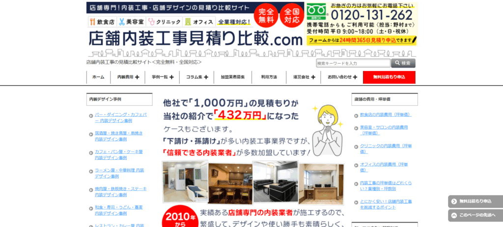 「店舗内装工事見積り比較.com」は、全国対応で飲食店や美容室などの店舗内装工事に特化した無料見積もり比較サービスです。匿名で複数の内装業者(3~5社)から見積もりとデザイン提案を受け取ることができ、手数料も一切かかりません。