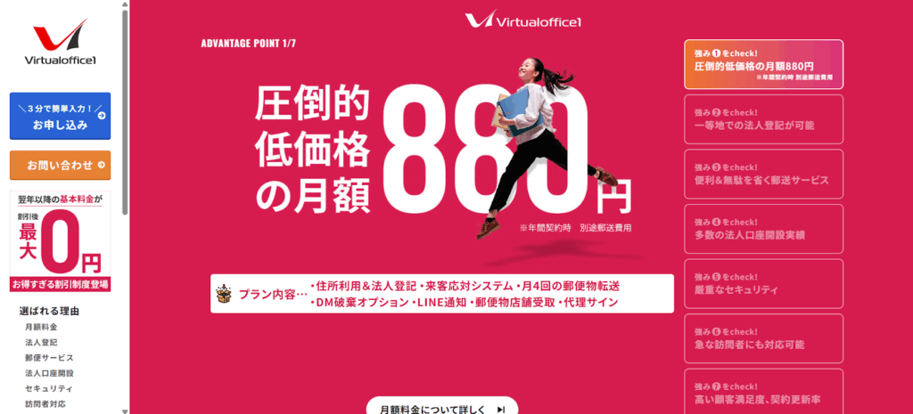 株式会社バーチャルオフィス1は、東京都渋谷区・千代田区、広島市に拠点を持つ格安バーチャルオフィスサービスを提供しています。月額880円から利用可能で、法人登記、住所利用、郵便物の転送やLINE通知、来客対応など、起業や副業を支援する多機能なサービスを提供しています。