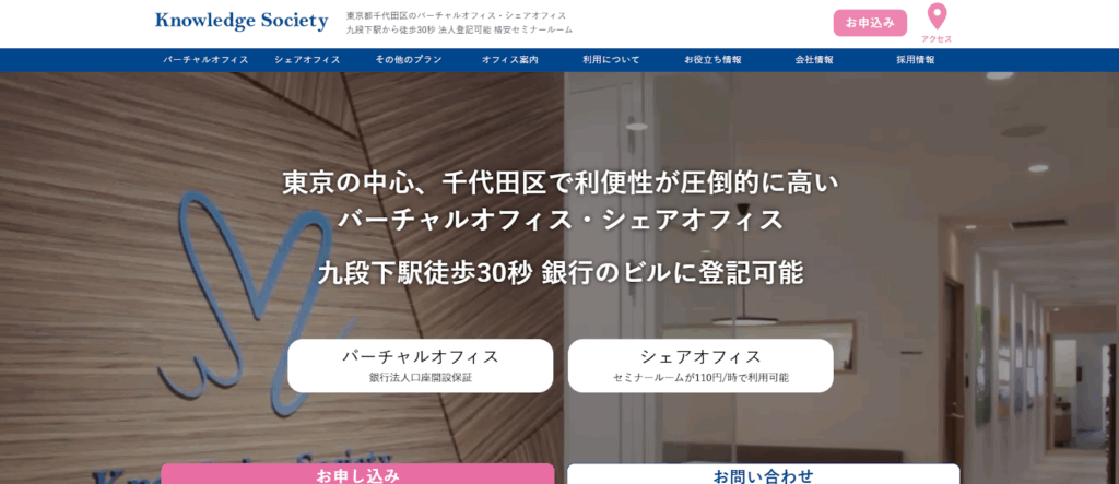 株式会社ナレッジソサエティは、東京都千代田区九段下駅から徒歩30秒の好立地に位置するシェアオフィス・バーチャルオフィス・レンタルオフィスの提供企業です。法人登記が可能で、銀行口座開設の実績も豊富なため、起業やスタートアップに最適な環境を整えています。